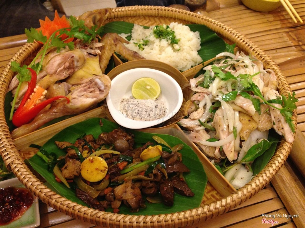 Gà mẹt tứ vị có đầy đủ vị : gà hấp chanh sả, nướng mật ong muối ớt, gà quay Singapore, gà ủ muối có kèm xôi hoặc bánh bao chiên , rau rừng thật tuyệt